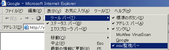 Internet Explorerの表示 - ツルバー - mixi監視バーをチェックすると日記を保護します。